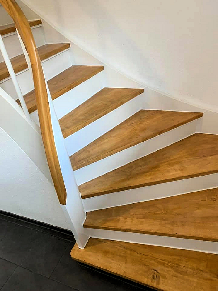 Hier wurden im Flur hochwertige Wechselmustertapeten in drei verschiedenen, aufeinander abgestimmten Designs verarbeitet und um eine offene Treppe herum gearbeitet. Die Oberfläche des Wandbelages ist äußerst fein und verlangte perfekte Wandvorbereitung.